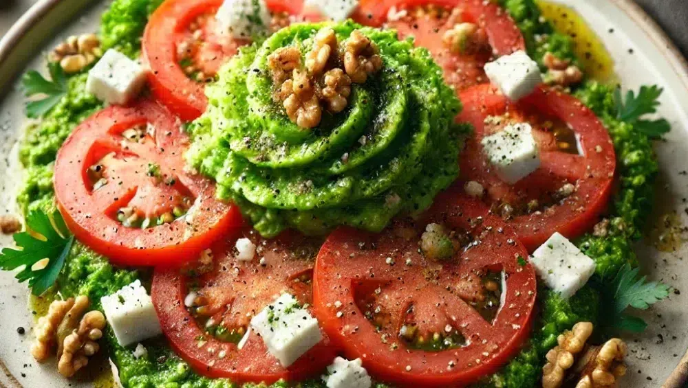 Das A’la Pesto mit Avocado und Walnüssen auf Tomaten mit Feta ist eine leichte, gesunde Vorspeise, die Cremigkeit, Knusprigkeit und aromatische Intensität perfekt vereint. Die Kombination aus Avocado, Walnüssen, Knoblauch und Tomaten bietet ein ausgewogenes Geschmacksprofil und wertvolle Nährstoffe. Dieses Pesto ist in wenigen Minuten zubereitet und überzeugt nicht nur geschmacklich, sondern auch optisch. Guten Appetit!