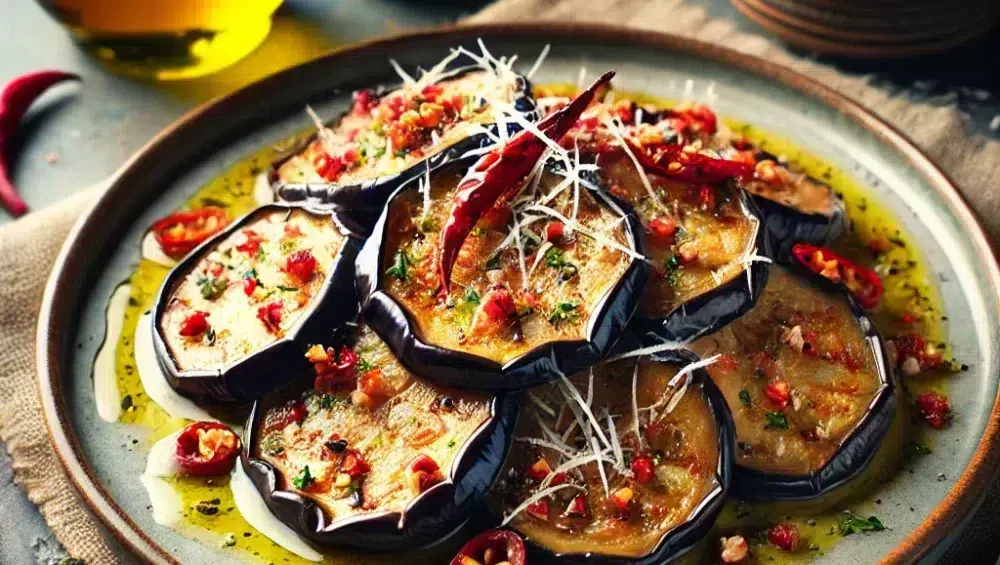 Für eine noch intensivere Geschmacksnote können Sie die gekochten Auberginen mit einem Esslöffel geriebenem Pecorino bestreuen. Der Käse verleiht dem Gericht eine würzige Tiefe, die hervorragend mit der Schärfe der Chilischote und der zarten Aubergine harmoniert.