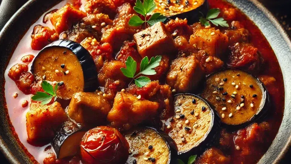 Auberginen-Gulasch mit Sesam ist ein Gericht, das klassische Kochtechniken mit einem Hauch exotischer Aromen verbindet. Knuspriger Sesam, weiche Auberginen und aromatischer Wein machen dieses Gericht nicht nur sättigend, sondern auch reich an tiefen, komplexen Geschmacksnoten. Perfekt für Familienessen oder elegante Dinnerpartys. Guten Appetit!
