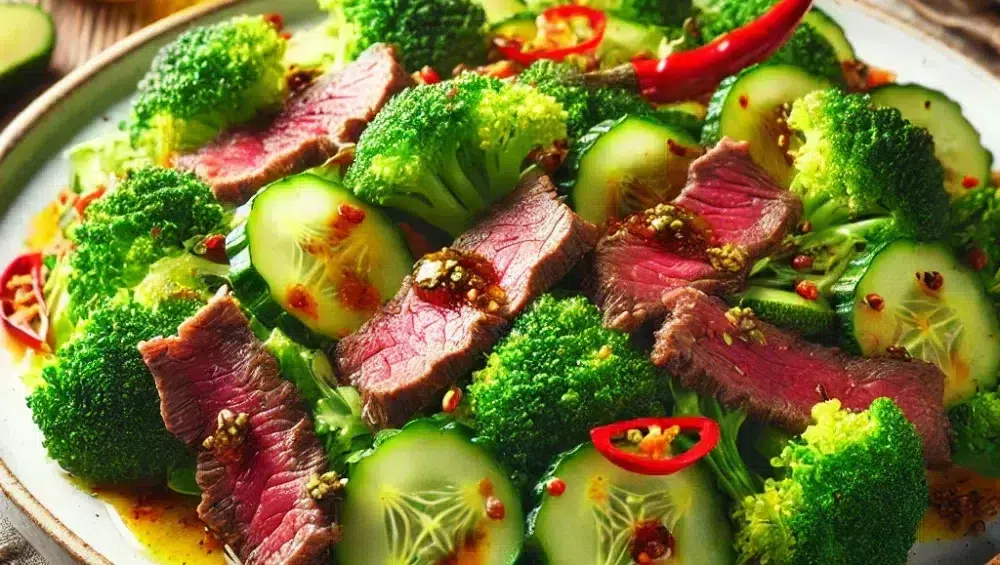 Der bunte Salat mit Rindfleisch ist die perfekte Wahl für eine leichte, aber dennoch sättigende Mahlzeit, die durch ihre Farbenpracht und intensiven Aromen begeistert. Die Kombination aus Gemüse wie Brokkoli und Gewürzgurken mit saftigem Rindfleisch macht diesen Salat zu einer vollwertigen Mahlzeit, die sowohl Liebhaber der gesunden Küche als auch diejenigen anspricht, die nach einer besonderen Vorspeise zum Abendessen oder Mittagessen suchen. Abgerundet wird das Ganze durch ein aromatisches Dressing aus Olivenöl, Weinessig und Chilisauce, das dem Gericht Charakter und eine feine Schärfe verleiht. Die Zubereitung dieses Salats ist schnell und einfach, und die Zutaten lassen sich nach Belieben anpassen. Das Rindfleisch, reich an Eiweiß und Eisen, ergänzt die knackigen Gemüse und den frischen Geschmack der Gewürzgurken perfekt. Dank der farbenfrohen Komposition auf dem Teller präsentiert sich der Salat appetitlich und ist sowohl für gesellige Anlässe als auch für ein alltägliches Essen zu Hause eine ausgezeichnete Wahl.