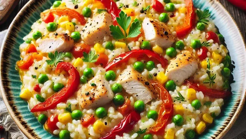 Buntes Risotto mit Hähnchen vereint einfache Zubereitung mit einer Fülle von Aromen. Der cremige Reis, zarte Hähnchenstücke und knackiges Gemüse ergeben eine sättigende Komposition, die selbst anspruchsvolle Feinschmecker überzeugt. Ein schneller Weg zu einer vollwertigen Mahlzeit, die nicht nur lecker, sondern auch optisch ansprechend ist. Guten Appetit!