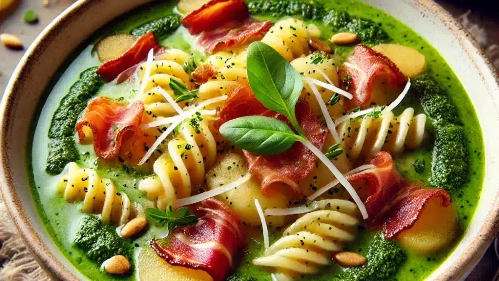 Die cremige Prosciutto-Suppe mit Pesto ist ein außergewöhnliches Gericht, das eine samtige Konsistenz mit dem intensiven Geschmack von Parmaschinken und hausgemachtem Pesto kombiniert. Diese exquisite Suppe ist nicht nur wärmend, sondern erfüllt auch die Ansprüche der anspruchsvollsten Feinschmecker. Kartoffeln sorgen für die cremige Basis, während Conchigliette-Nudeln eine dezente Textur hinzufügen. Das Ganze wird von einem aromatischen Pesto abgerundet, das mit frischem Basilikum, Knoblauch und Pinienkernen jede Portion veredelt. Parmaschinken verleiht der Suppe eine charakteristische, leicht salzige Note, die perfekt mit den anderen Zutaten harmoniert.