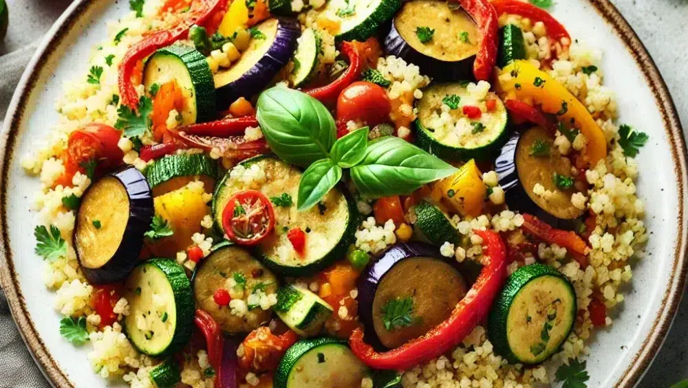 Den fertigen Couscous mit dem gebratenen Gemüse vermengen. Auf einen Teller geben, mit frischen Basilikumblättern garnieren und warm oder kalt servieren.