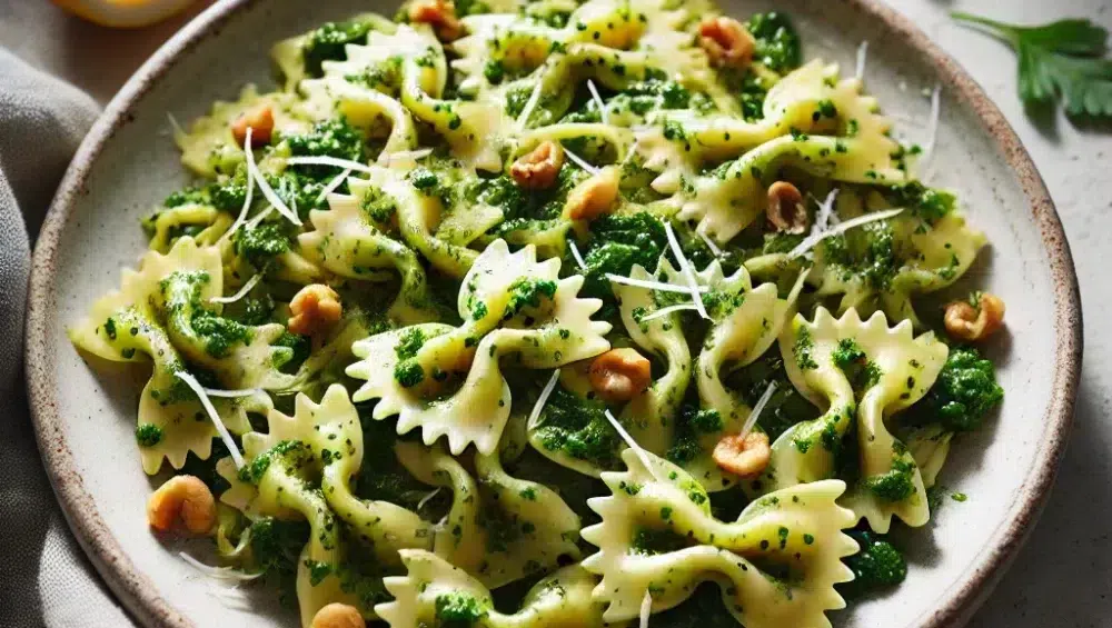 Farfalle mit Petersilien-Walnuss-Pesto ist ein Gericht, das Einfachheit mit außergewöhnlichem Geschmack verbindet. Frische Petersilie, Walnüsse und Zitrone ergeben ein Pesto, das nicht nur köstlich ist, sondern auch viele wertvolle Nährstoffe liefert. Eine perfekte Wahl für ein schnelles, leichtes und dennoch sättigendes Mittagessen, das sowohl im Alltag als auch bei besonderen Gelegenheiten begeistert. Guten Appetit!