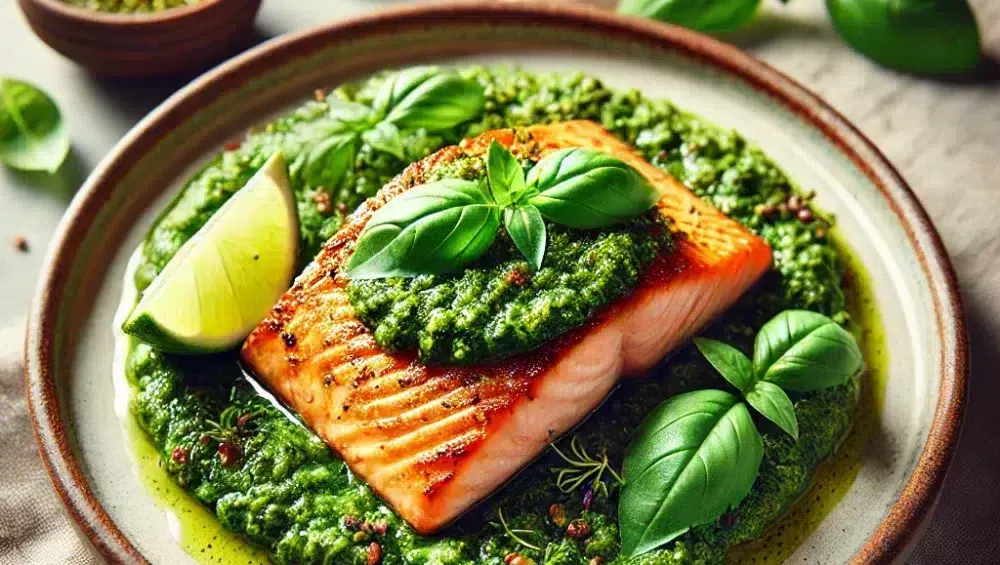 Gebratener Lachs mit Pesto vereint die Zartheit des Fisches mit der intensiven Würze von Kräutern und Knoblauch. Mit diesem Rezept kannst du auf einfache Weise ein raffiniertes Gericht zubereiten, das sowohl optisch beeindruckt als auch hervorragend schmeckt. Das aromatische Pesto und der saftige Fisch sorgen dafür, dass jeder Bissen ein Genuss ist. Eine perfekte Wahl für ein elegantes Mittag- oder Abendessen im Kreise deiner Liebsten. Guten Appetit!