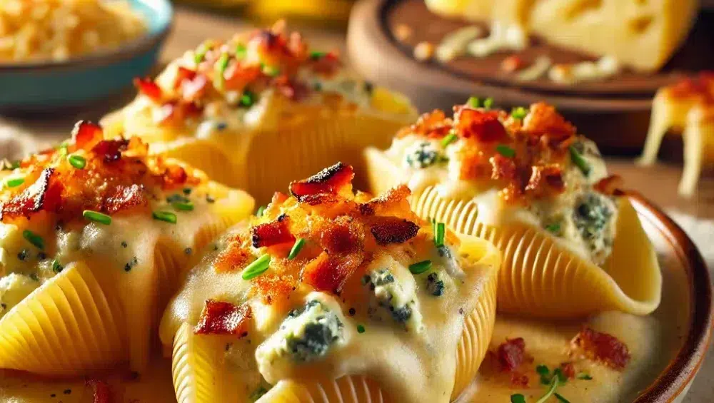 Gefüllte Muschelnudeln in Käsesauce sind ein cremiges Geschmackserlebnis, das besonders Käseliebhaber und Fans von rauchigen Aromen begeistern wird. Die Kombination aus knusprigem Speck, zarter Ricotta und intensivem Blauschimmelkäse macht dieses Gericht nicht nur sättigend, sondern auch besonders aromatisch. Einfach zuzubereiten und dennoch raffiniert – eine ideale Wahl für ein Essen, das jeden beeindruckt. Guten Appetit!