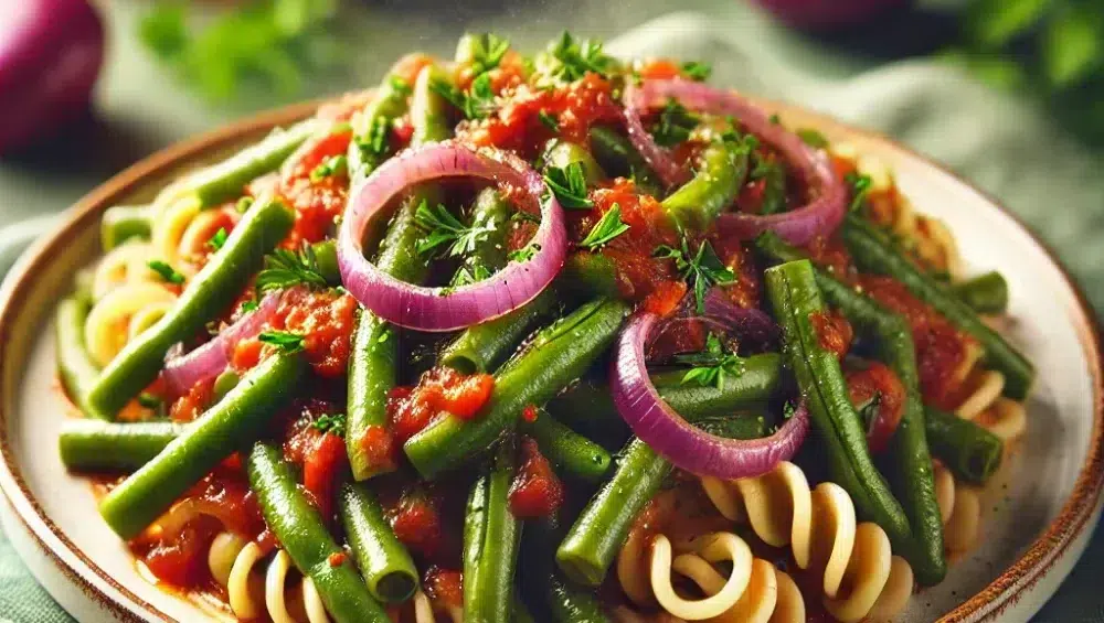 Grüne Bohnen sind ein vielseitiges Gemüse, das man das ganze Jahr über in der Küche verwenden sollte. Sie sind nicht nur lecker, sondern auch reich an Vitaminen und Mineralstoffen – ideal für eine gesunde und nahrhafte Mahlzeit. In Kombination mit einer aromatischen Tomatensauce, roten Zwiebeln und zarten Nudeln bekommen die grünen Bohnen eine neue, aufregende Dimension. Dieses Gericht ist leicht, aber sättigend, und dank frischer Kräuter wie Petersilie und Basilikum schmeckt es besonders frisch und aromatisch. Es eignet sich hervorragend als eigenständige Mahlzeit oder als Beilage zu Fleisch- oder Fischgerichten.