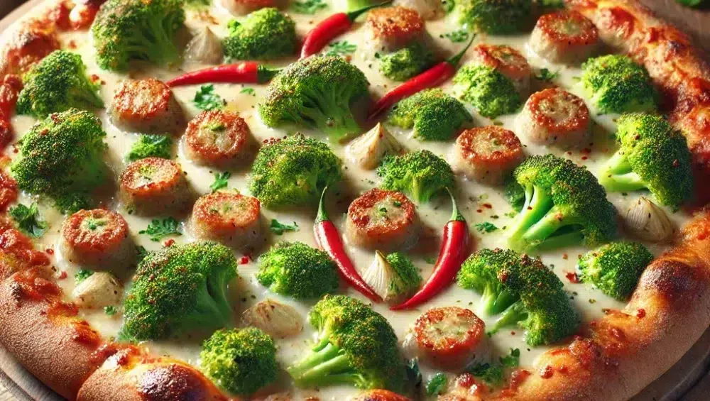 Mit Brokkoli und Bratwurst gefüllte Pizza – eine originelle Geschmackskombination