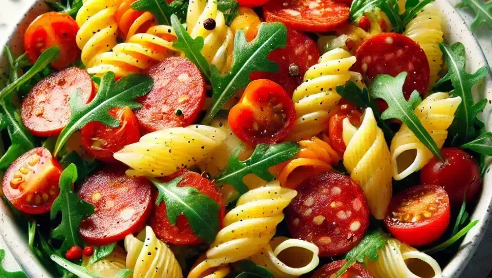 Der Nudelsalat mit Salami, Kirschtomaten und Rucola ist ein ideales Gericht, das einfache Zubereitung mit einem reichen Geschmackserlebnis verbindet. Knusprige Salami, saftige Tomaten, leichter Rucola und ein passendes Dressing schaffen eine Harmonie, die jeden Gaumen erfreut. Dieses Gericht ist sowohl als schneller Lunch für die Arbeit als auch als elegante Vorspeise bei Treffen mit Freunden hervorragend geeignet. Guten Appetit!