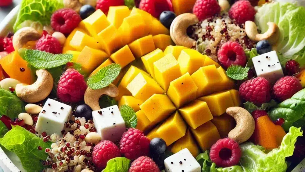 Der Obst-Gemüse-Salat mit Käse ist die perfekte Wahl für alle, die ein leichtes, aber sättigendes Gericht suchen. Die Kombination aus frischem Obst und Gemüse mit kräftigem Blauschimmelkäse wie Gorgonzola schafft eine einzigartige Harmonie der Aromen. Die Cremigkeit des Käses kontrastiert wunderbar mit den knackigen Cashewkernen, während die Saftigkeit von Mango und Himbeeren dem Salat eine exotische Note verleiht. Dieses Gericht ist nicht nur lecker, sondern auch reich an Nährstoffen, dank Quinoa und Adzukibohnen, die eine hervorragende Quelle für Eiweiß und Ballaststoffe darstellen.
