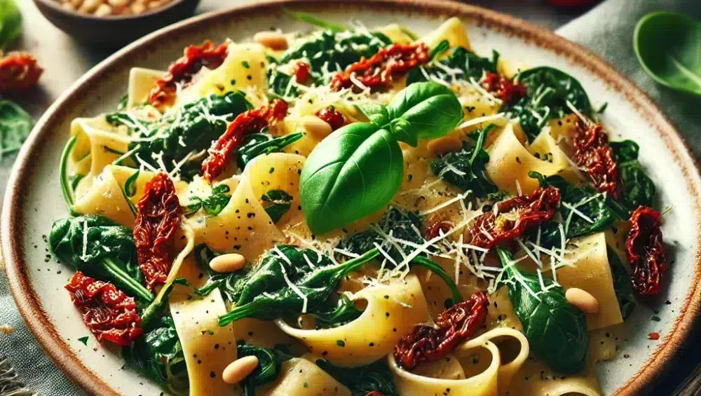 Pasta mit Pinienkernen ist das perfekte Gericht für alle, die schnelle, leckere und nahrhafte Mahlzeiten schätzen. Pappardelle, die breiten Bandnudeln, verbinden sich hier mit zartem Spinat, süßen getrockneten Tomaten und knusprigen Pinienkernen. Die gerösteten Pinienkerne verleihen diesem einfachen Gericht eine raffinierte Note, während Parmesan und frisches Basilikum das Ganze harmonisch abrunden. Dieses Rezept eignet sich sowohl für ein tägliches Mittagessen als auch für ein elegantes Abendessen.