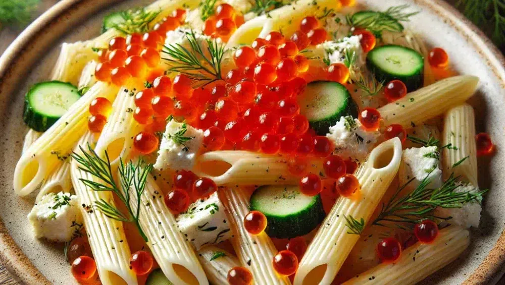 Penne mit Lachskaviar, Kräutern und Feta ist ein Gericht, das Eleganz und Einfachheit auf köstliche Weise vereint. Der raffinierte Geschmack von Lachskaviar und Kapern, kombiniert mit der Frische von Gurke, Feta und Ei, ergibt eine aromatische, dennoch leichte Mahlzeit, die sich perfekt für besondere Anlässe eignet. Guten Appetit!