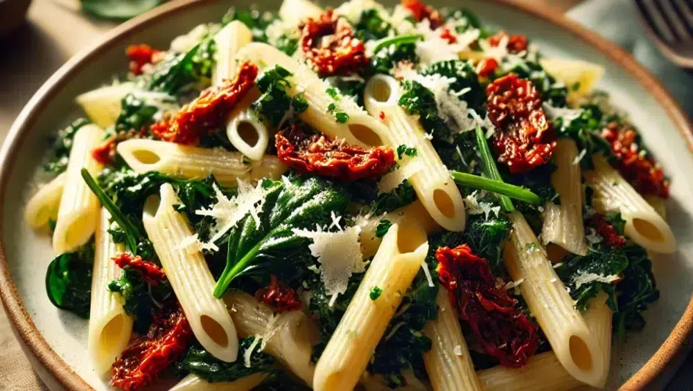 Penne mit Spinat, getrockneten Tomaten und Feta vereinen einfache Zubereitung mit einem reichen Geschmackserlebnis. Der leichte Spinat, die intensiven getrockneten Tomaten und der cremige Feta bilden eine harmonische Komposition, die sowohl für ein tägliches Mittagessen als auch für ein besonderes Abendessen geeignet ist. Dieses Gericht schmeckt nicht nur hervorragend, sondern liefert auch wertvolle Nährstoffe – eine ideale Wahl für alle, die sich gesund ernähren möchten. Guten Appetit!