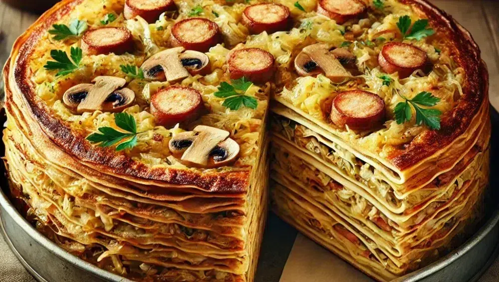 Wenn du ein Rezept suchst, das traditionellen Geschmack mit einem modernen Ansatz verbindet, ist der Pfannkuchen-Kohl-Kuchen die perfekte Wahl! Dieses Gericht erinnert an einen klassischen Kuchen, doch anstelle von süßem Teig werden Pfannkuchen verwendet, die mit einer köstlichen Füllung aus Kohl, Wurst, Zwiebeln und Champignons geschichtet werden. Ideal für ein Familienessen oder ein Treffen mit Freunden – dieser Kuchen sorgt für die heimelige Atmosphäre einer traditionellen Mahlzeit und überrascht gleichzeitig mit seiner außergewöhnlichen Form.