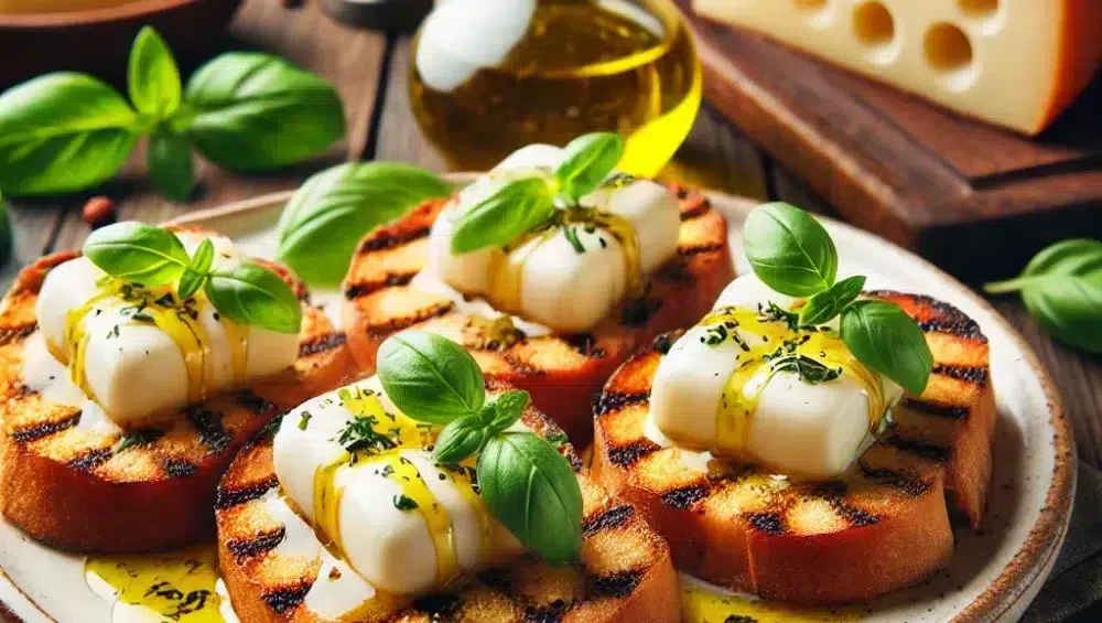 Einfache, aber äußerst schmackhafte Crostini mit Provolone und Olivenöl sind ein perfekter Snack für gesellige Runden oder eine elegante Beilage zum Mittagessen.