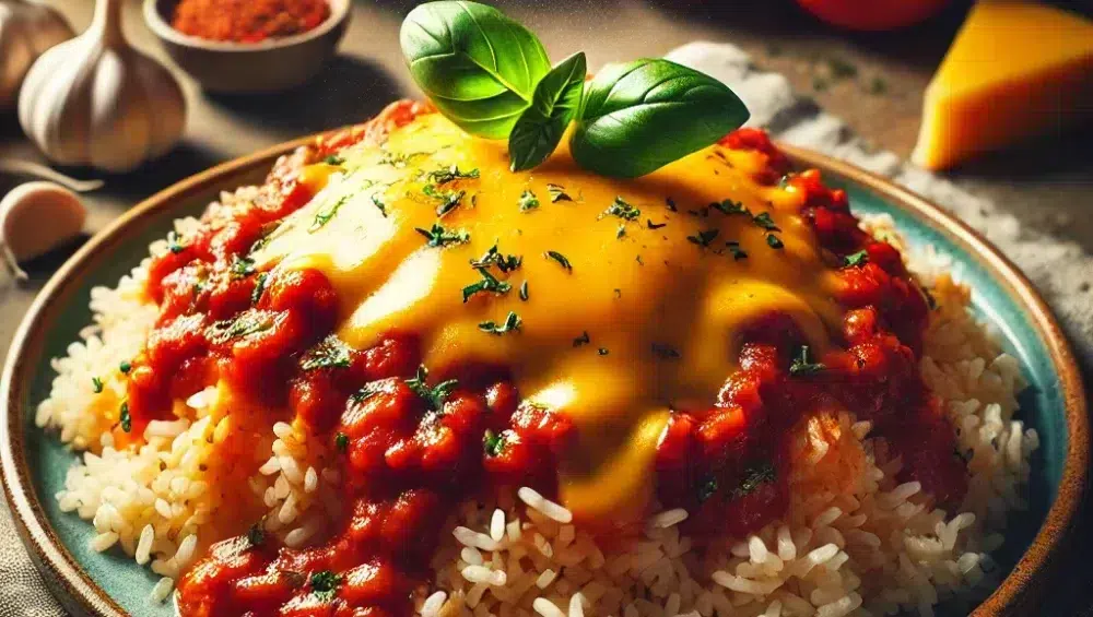 Gib die fertige Tomatensauce zum gekochten Reis und mische alles gründlich, sodass der Reis die Sauce und den Käse gleichmäßig aufnimmt. Das Ergebnis ist ein aromatisches Gericht voller Geschmack.