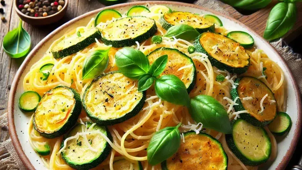 - In einer Pfanne den Knoblauch anbraten, dann entfernen. Die Zucchini, die gekochte Pasta und etwas Kochwasser hinzufügen. Gut mischen und nach Bedarf mehr Wasser hinzufügen, bis die Pasta cremig ist.