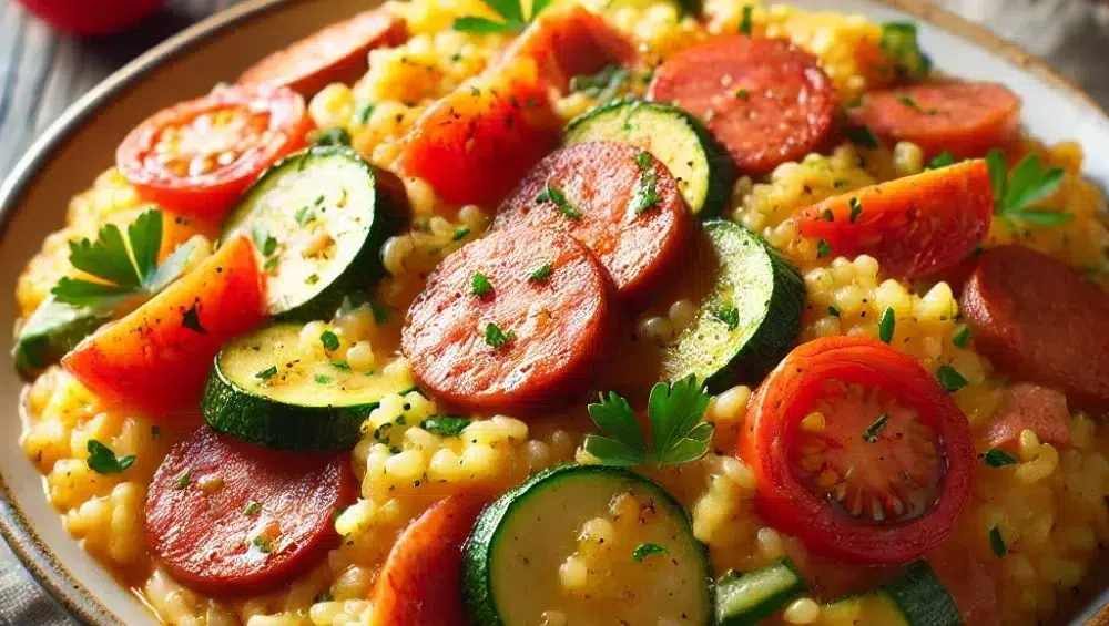 Risotto ist ein klassisches italienisches Gericht, das seit Jahren mit seiner cremigen Konsistenz und dem feinen Geschmack begeistert. Risotto mit Tomaten und Zucchini ist eine leichtere, aber dennoch äußerst aromatische Variante dieses Gerichts. Die Zugabe von Zucchini und Tomaten sorgt für Frische und Leichtigkeit, was dieses Gericht zu einer idealen Wahl für jede Jahreszeit macht. In Kombination mit warmem Gemüsefond erhält der Arborio-Reis die charakteristische Cremigkeit, die Risotto auszeichnet. Für mehr Würze haben wir aromatische Wurststücke in das Rezept integriert, die den Gesamtgeschmack unterstreichen und dem Gericht eine besondere Note verleihen. Risotto mit Tomaten und Zucchini ist die perfekte Wahl für ein schnelles Mittag- oder Abendessen, das sowohl Liebhaber italienischer Küche als auch diejenigen begeistert, die nach einfachen, aber eindrucksvollen Rezepten suchen. Die Zubereitung erfordert etwas Geduld, aber das Ergebnis – cremiger Reis mit aromatischen Beilagen – ist jede Mühe wert.