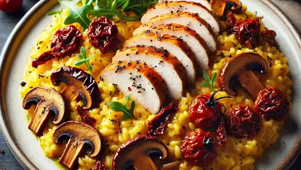 Safranrisotto mit Steinpilzen, getrockneten Tomaten und gebratener Hähnchenbrust ist ein Gericht, das selbst die anspruchsvollsten Gaumen zufriedenstellt. Es ist die perfekte Wahl für ein Abendessen, das durch seine Geschmacksvielfalt und Eleganz überzeugt. Probiere es aus und entdecke, wie einfach es ist, in der eigenen Küche etwas so Köstliches und Eindrucksvolles zu zaubern!