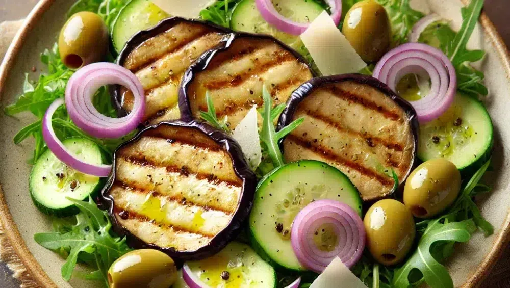 Salate sind eine hervorragende Möglichkeit, eine gesunde und leichte Mahlzeit schnell und mühelos zuzubereiten. Der Salat mit gebackenem Auberginen, Rucola und Gurke ist eine außergewöhnliche Geschmackskomposition – leicht würziger Rucola, erfrischende Gurke und intensiv gebackene Aubergine ergänzen sich perfekt. Zusätzliche Zutaten wie Oliven, Zwiebeln und Parmesan verleihen dem Gericht eine mediterrane Note, während Balsamico-Essig und Olivenöl dem Salat seinen charakteristischen, reichen Geschmack geben. Dieser Salat eignet sich sowohl als eigenständige Mahlzeit als auch als Beilage zu einem größeren Menü.
