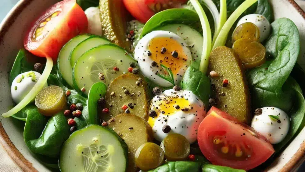 Der Spinatsalat mit eingelegtem Patisson ist ein außergewöhnlich einfaches, aber gleichzeitig geschmackvolles Gericht, das gesunde und nährstoffreiche Zutaten kombiniert. Dieses Rezept ist ideal für alle, die leichte und dennoch sättigende Mahlzeiten suchen, die in wenigen Minuten zubereitet sind. Der zarte Spinat, die säuerlichen Gewürzgurken, die saftige Tomate und die eingelegten Patissons ergeben eine Komposition, die sowohl geschmacklich als auch optisch begeistert. Probiere es aus und entdecke, wie einfach Genuss sein kann! Guten Appetit!