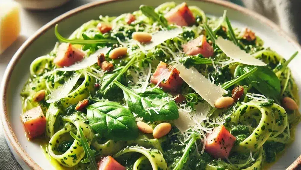 Tagliatelle mit Rucola-Spinat-Pesto ist ein Gericht, das die Zartheit der Pasta mit dem intensiven, aromatischen Geschmack frischer Rucola- und Spinatblätter kombiniert. Geröstete Pinienkerne und Parmesan verleihen dem Pesto eine geschmackliche Tiefe, während eine feine Zitronenschalennote für eine erfrischende Säure sorgt. Dieses Gericht ist perfekt für ein schnelles, aber elegantes Mittag- oder Abendessen. Es ist vitaminreich, leicht und dennoch sättigend – ideal für alle, die eine gesunde Küche lieben.