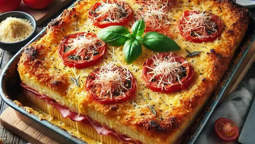 - Die Füllung auf der Teigbasis verteilen: Käse, Tomatenscheiben und Prosciutto gleichmäßig darauflegen. Diese Zutaten verleihen dem Auflauf ein reichhaltiges Aroma, und der geschmolzene Käse sorgt für eine angenehme, cremige Konsistenz.