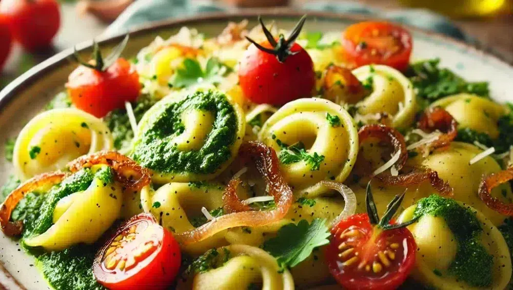 Tortellini gehören zu den bekanntesten Gerichten der italienischen Küche und sind in vielen Varianten zu finden. Die kleinen Teigtaschen, gefüllt mit Fleisch, Käse oder Pilzen, bilden die perfekte Basis für ein köstliches, geschmackvolles Gericht. In diesem Rezept kombinieren wir Tortellini mit einem hausgemachten Petersilienpesto, das dem Gericht Frische und Würze verleiht. Ergänzt wird das Ganze durch süßlich angebratene Kirschtomaten und Zwiebeln. Ein einfaches, aber äußerst aromatisches Gericht, das in wenigen Minuten zubereitet ist.