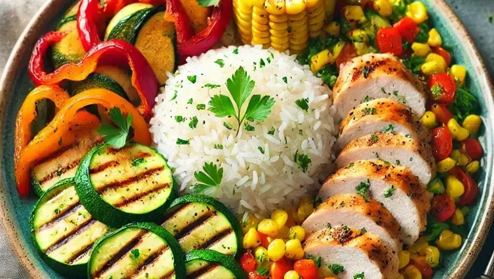 Tricolore-Reis mit gegrilltem Hähnchen und Gemüse ist ein Gericht, das durch Geschmack, Farben und einfache Zubereitung überzeugt. Es ist eine vollwertige Mahlzeit, die sowohl im Alltag als auch bei Familienfeiern oder geselligen Treffen punktet. Gegrilltes Gemüse, saftiges Hähnchen und aromatischer Reis ergeben eine harmonische Komposition, die alle Liebhaber gesunder und köstlicher Küche begeistern wird. Probieren Sie dieses Rezept aus und entdecken Sie, wie einfach es ist, ein farbenfrohes und geschmackvolles Gericht zuzubereiten. Guten Appetit!